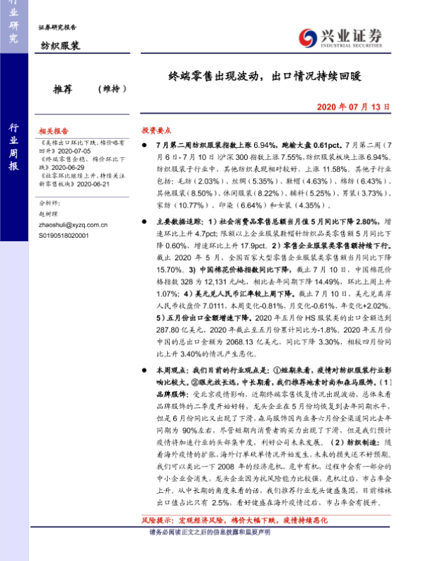 【兴业证券】【20200713】20200713-兴业证券-纺织服装行业周报:终端零售出现波动,出口情况持续回暖-10页 行业研究