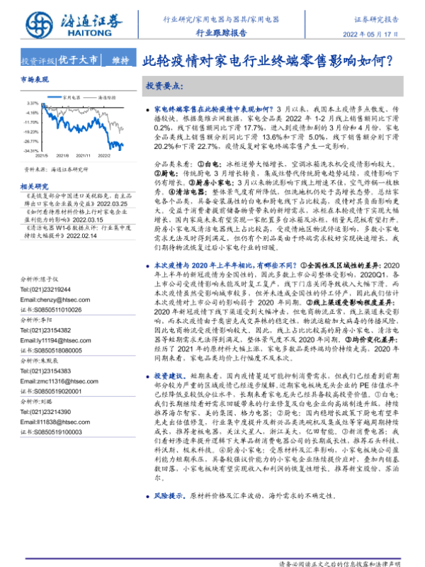 【海通证券】【20220517】20220517-海通证券-家用电器行业跟踪报告:此轮疫情对家电行业终端零售影响如何?-6页 行业研究