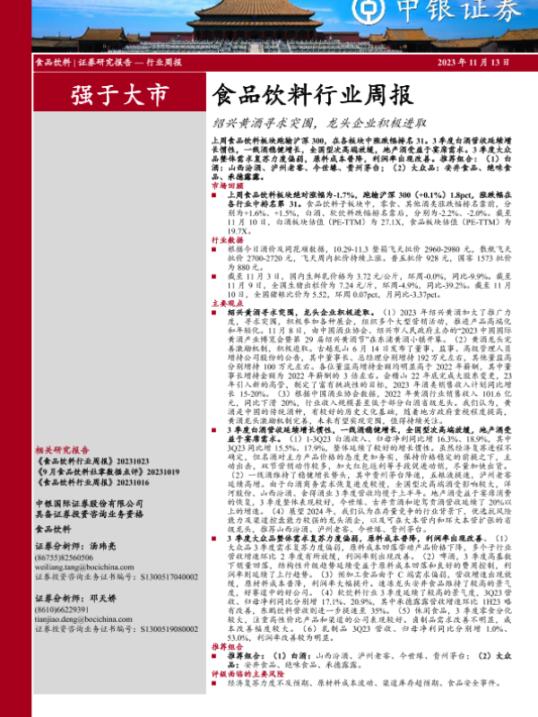 【中银证券】【20231113】20231113-中银证券-食品饮料行业周报:绍兴黄酒寻求突围,龙头企业积极进取-16页 行业研究