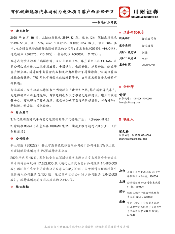 【川财证券】【20200618】制造行业日报:百亿级新能源汽车与动力电池项目落户西安经开区-3页 证券期货研究报告