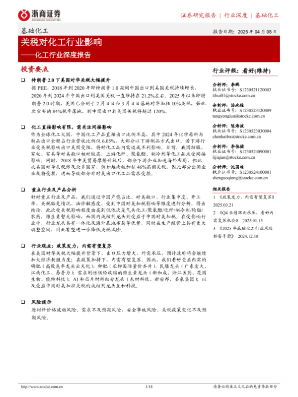 【浙商证券】【20250408】化工行业深度报告:关税对化工行业影响-18页 证券期货研究报告