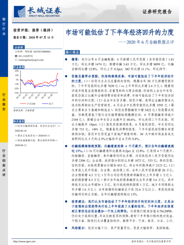 【长城证券】【20200711】2020年6月金融数据点评:市场可能低估了下半年经济回升的力度-5页 行业研究