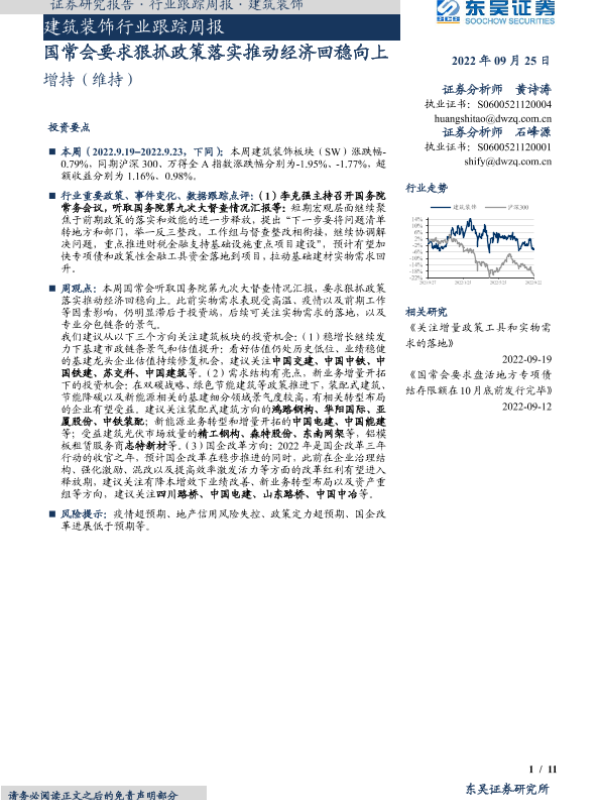 【东吴证券】【20220925】建筑装饰行业跟踪周报:国常会要求狠抓政策落实推动经济回稳向上-11页 行业研究