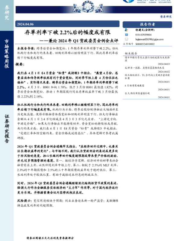 【国泰君安证券】【20240406】兼论2024年Q1货政委员会例会点评:存单利率下破2.2%后的幅度或有限-11页 行业研究
