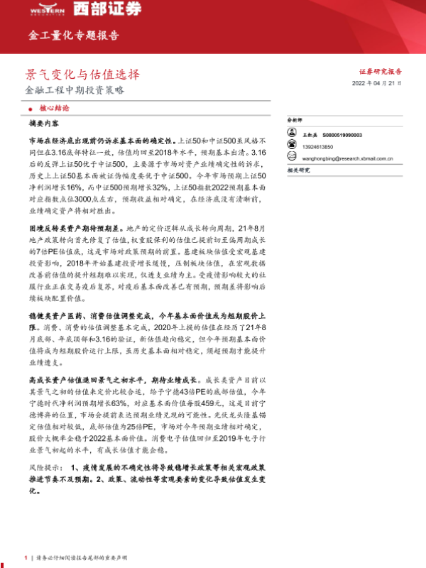 【西部证券】【20220421】金工量化专题报告:金融工程中期投资策略,景气变化与估值选择-24页 行业研究