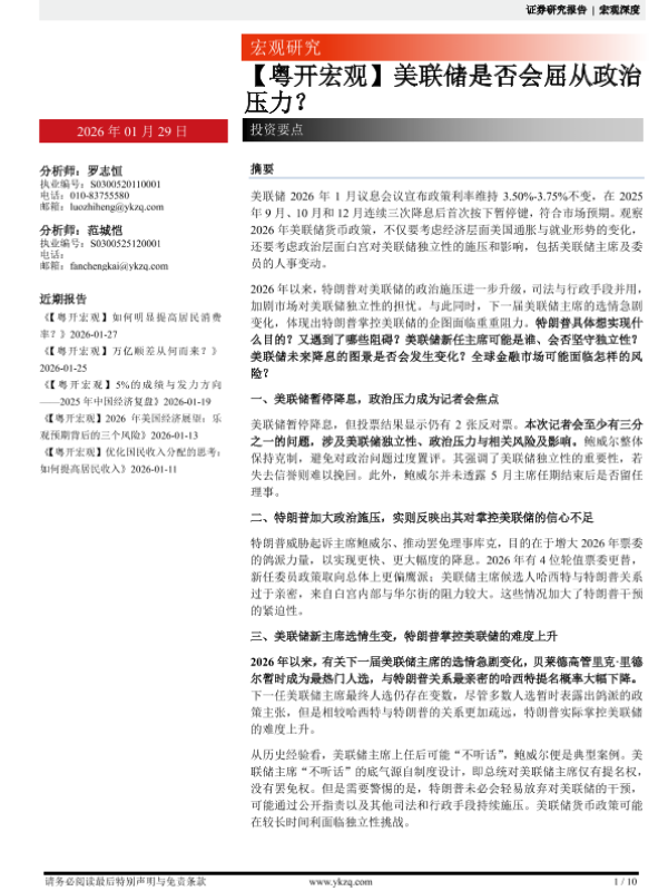 【粤开证券】【202601】美联储是否会屈从政治压力?-10页 证券期货研究报告