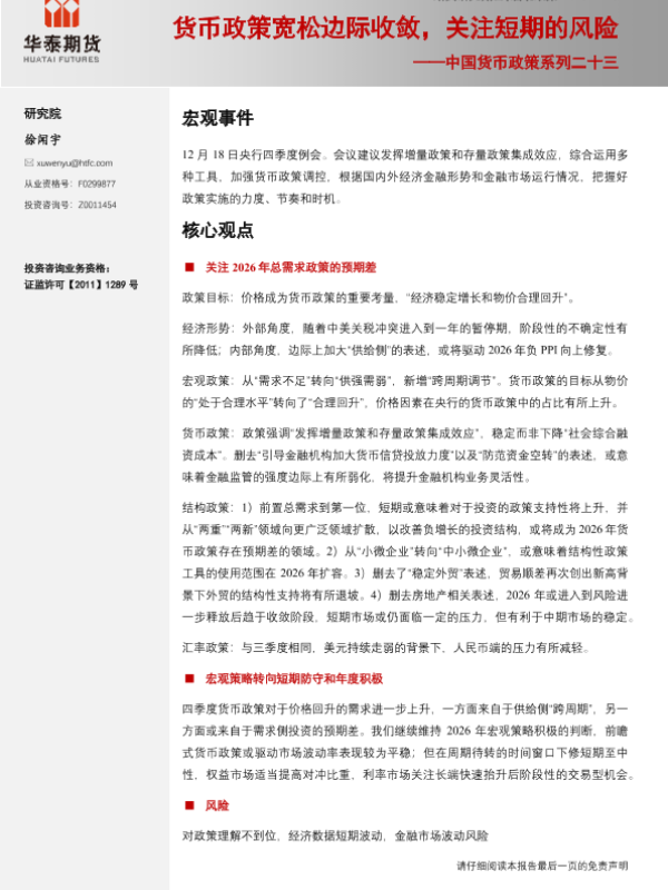 【华泰期货】【202312】货币政策宽松边际收敛,关注短期的风险——中国货币政策系列二十三-13页 证券期货研究报告