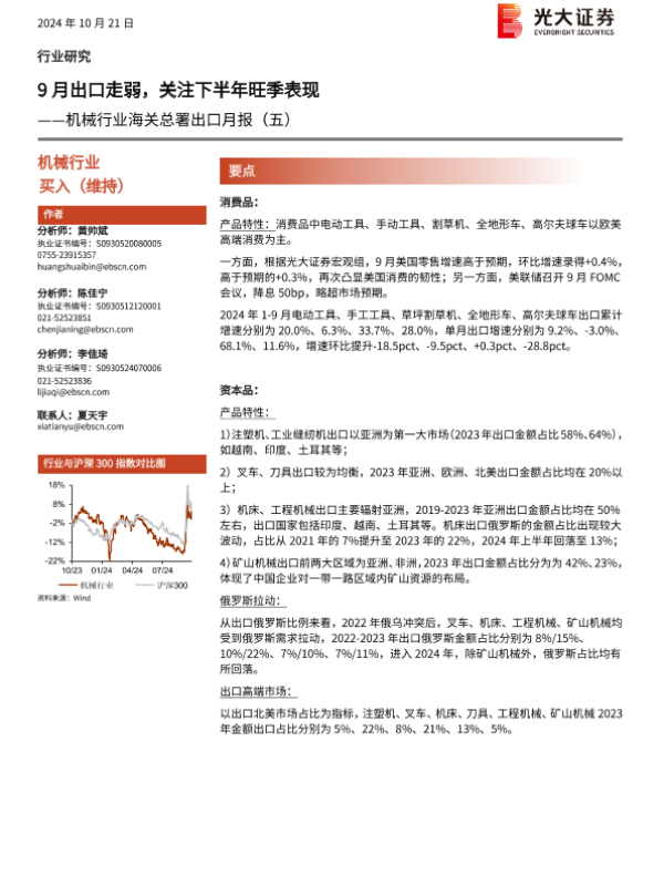 【光大证券】【20241021】机械行业海关总署出口月报(五):9月出口走弱,关注下半年旺季表现-16页 行业研究