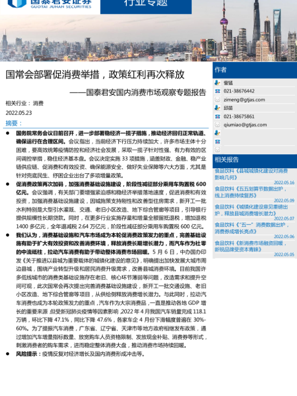 【国泰君安证券】【20220523】国常会部署促消费举措,政策红利再次释放-2页 宏观策略