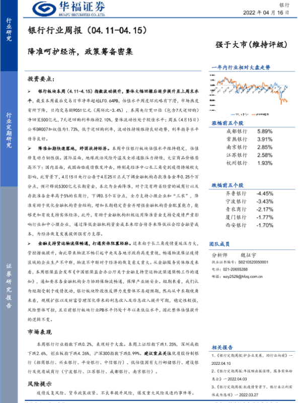【华福证券】【20220416】银行行业周报:降准呵护经济,政策筹备密集-15页 行业研究
