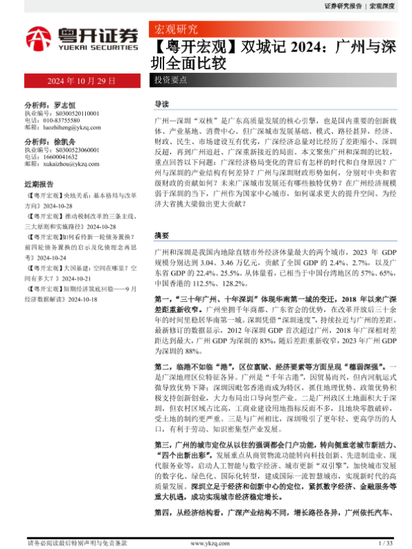 【粤开证券】【20241029】【粤开宏观】双城记2024:广州与深圳全面比较-33页 宏观策略