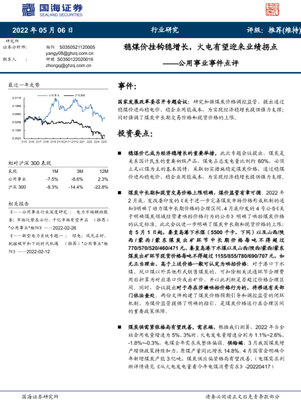 【国海证券】【20220506】稳煤价挂钩稳增长,火电有望迎来业绩拐点-5页 行业研究