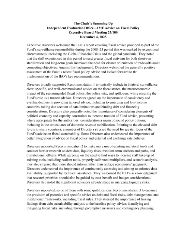 【Independent Evaluation Office—IMF】【202512】The Chair’s Summing Up Independent Evaluation Office—IMF Advice on Fiscal Policy Executive Board Meeting-2页 政策文件