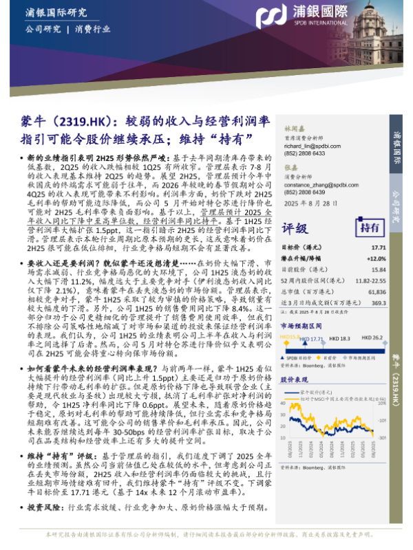 【浦银国际】【20250828】蒙牛(2319.HK)-较弱的收入与经营利润率指引可能令股价继续承压;维持“持有”-9页 证券期货研究报告