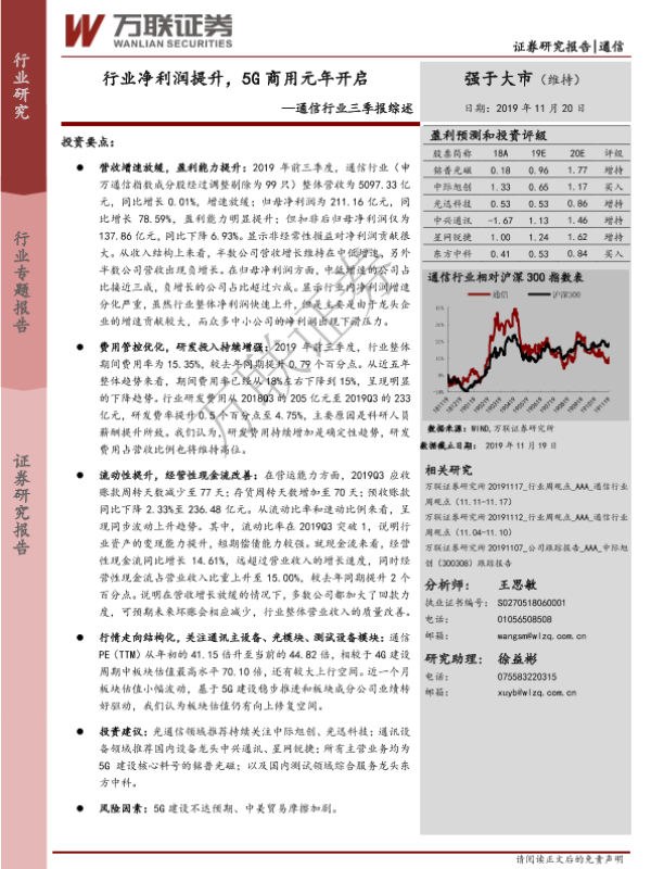【万联证券】【20191120】通信行业三季报综述:行业净利润提升,5G商用元年开启-16页 行业研究