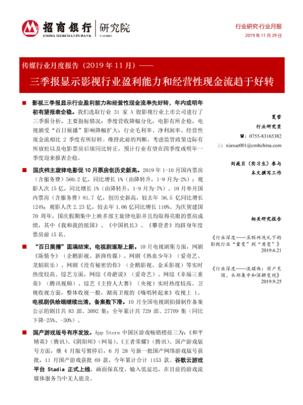 【招商银行】【20191129】传媒行业月度报告(2019年11月)——三季报显示影视行业盈利能力和经营性现金流趋于好转-21页 行业研究