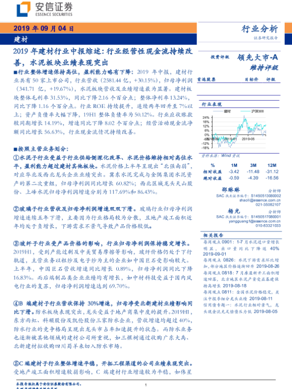 【安信证券】【20190904】2019年建材行业中报综述:行业经营性现金流持续改善,水泥板块业绩表现突出-22页 行业研究