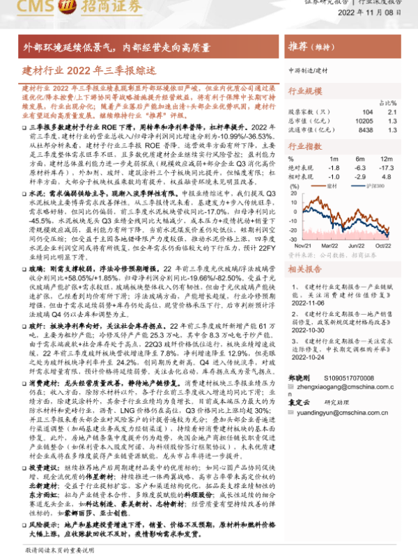 【海通证券】【20221108】建材行业2022年三季报综述:外部环境延续低景气,内部经营走向高质量-30页 行业研究