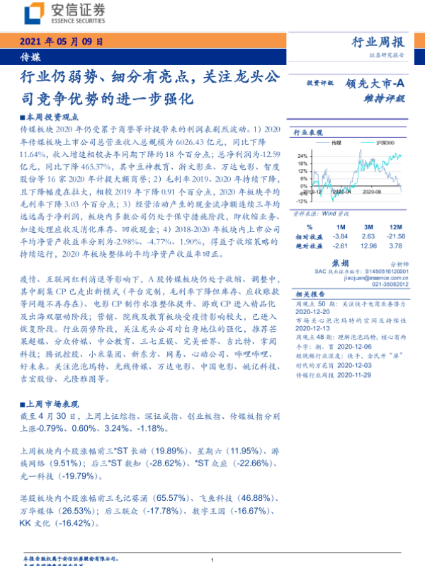 【安信证券】【20210509】20210509-安信证券-传媒行业周报:行业仍弱势、细分有亮点,关注龙头公司竞争优势的进一步强化-13页 行业研究
