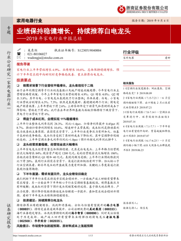 【浙商证券】【20190904】2019年家电行业中报总结:业绩保持稳健增长,持续推荐白电龙头-13页 行业研究