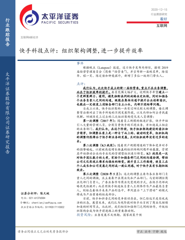【太平洋证券】【20201215】互联网:快手科技点评:组织架构调整,进一步提升效率-9页 行业研究