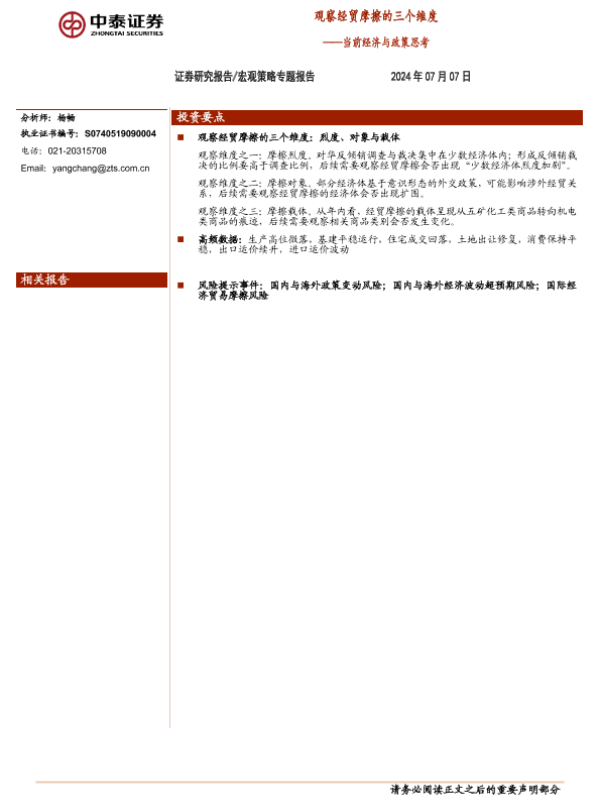 【中泰证券】【20240707】当前经济与政策思考:观察经贸摩擦的三个维度-19页 行业研究