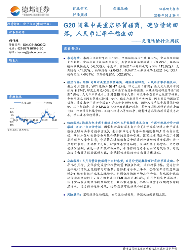 【德邦证券】【20190630】G20闭幕中美重启经贸磋商,避险情绪回落,人民币汇率平稳波动-12页 行业研究