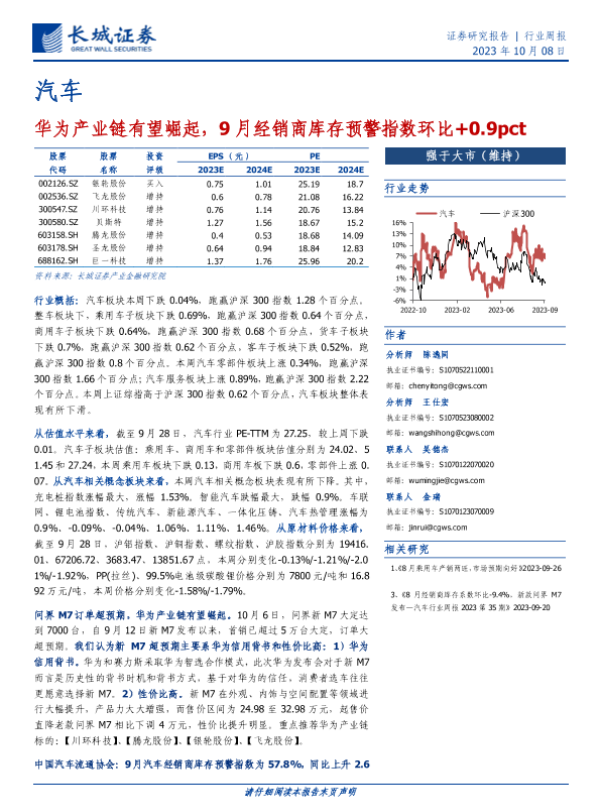 【长城证券】【20231008】20231008-长城证券-汽车行业周报:华为产业链有望崛起,9月经销商库存预警指数环比+0.9pct-12页 行业研究