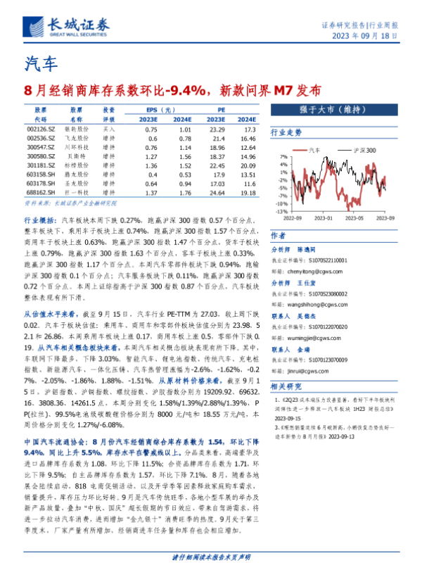 【长城证券】【20230918】20230918-长城证券-汽车行业周报:8月经销商库存系数环比-9.4%,新款问界M7发布-13页 行业研究