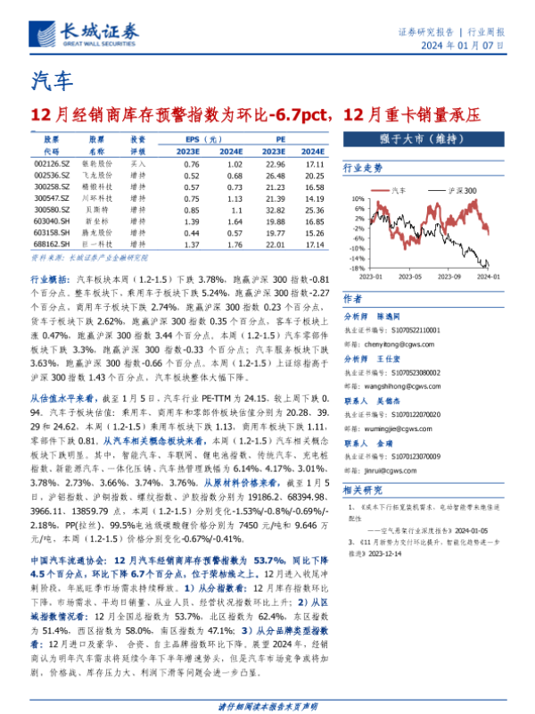 【长城证券】【20240107】20240107-长城证券-汽车行业周报:12月经销商库存预警指数为环比-6.7pct,12月重卡销量承压-13页 行业研究