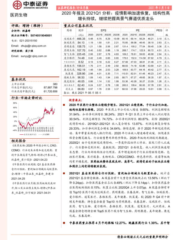 【中泰证券】【20210505】医药生物2020年报及2021Q1分析:疫情影响加速恢复,结构性高增长持续,继续把握高景气赛道优质龙头-29页 行业研究