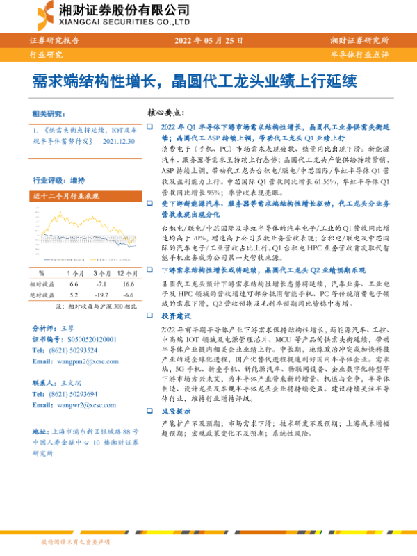 【湘财证券】【20220525】20220525-湘财证券-半导体行业点评:需求端结构性增长,晶圆代工龙头业绩上行延续-8页 行业研究