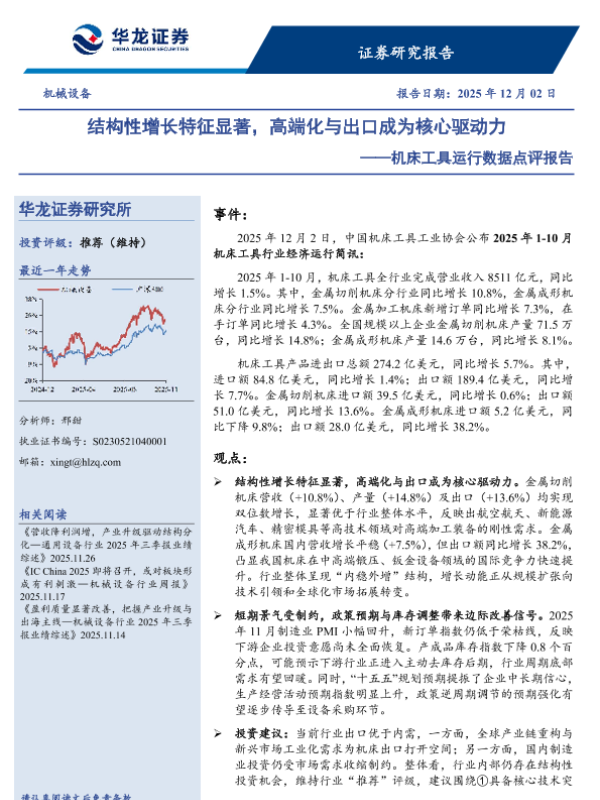 【华龙证券】【202512】结构性增长特征显著,高端化与出口成为核心驱动力——机床工具运行数据点评报告-3页 证券期货研究报告