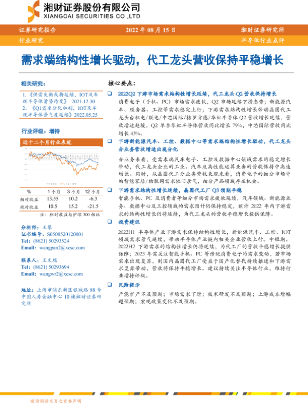 【湘财证券】【20220815】20220815-湘财证券-半导体行业点评:需求端结构性增长驱动,代工龙头营收保持平稳增长-8页 行业研究