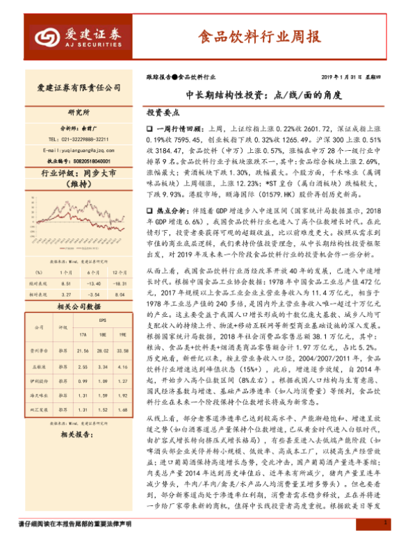 【爱建证券】【20190131】20190131-爱建证券-食品饮料行业周报:中长期结构性投资:点 线 面的角度-41页 行业研究