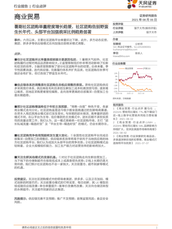 【天风证券】【20210805】暑期社区团购单量密度增长趋缓,社区团购告别野蛮生长年代、头部平台加强统采比例趋势显著-2页 行业研究