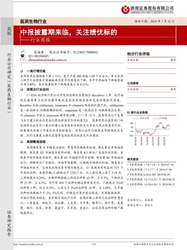 【浙商证券】【20190721】医药生物行业周报:中报披露期来临,关注绩优标的-29页 行业研究