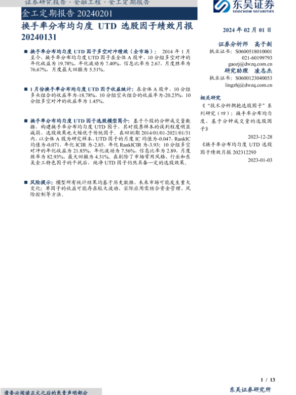 【东吴证券】【20240201】金工定期报告:换手率分布均匀度UTD选股因子绩效月报-13页 行业研究
