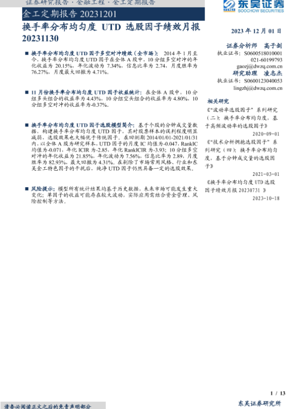 【东吴证券】【20231201】金工定期报告:换手率分布均匀度UTD选股因子绩效月报-13页 行业研究