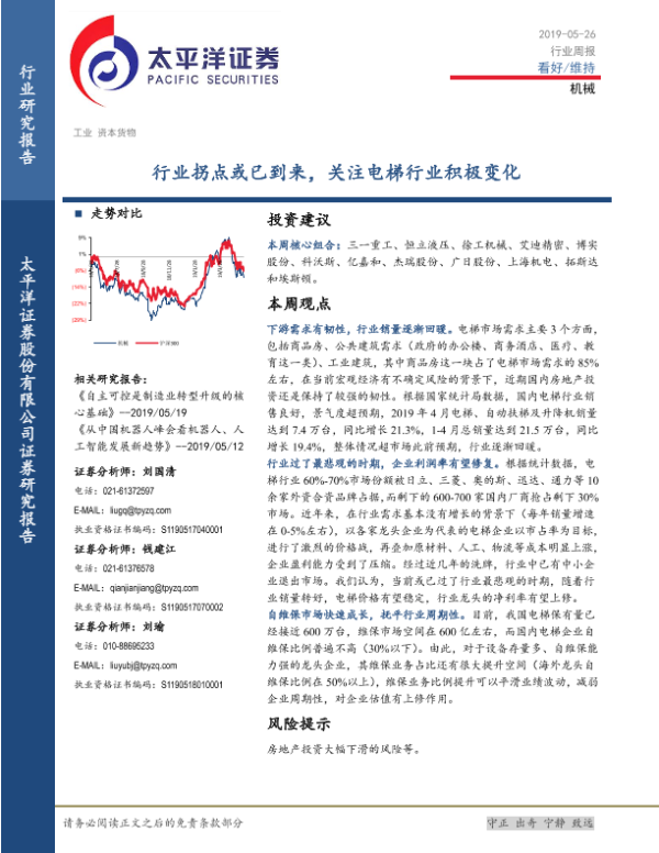 【太平洋证券】【20190526】20190526-太平洋-机械行业周报:行业拐点或已到来,关注电梯行业积极变化-10页 行业研究