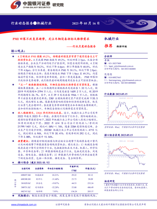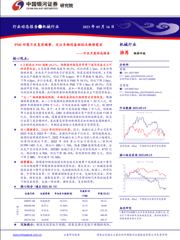 【银河证券】【20230516】20230516-中国银河-机械行业月度动态报告:PMI回落不改复苏趋势,关注车辆设备招标及维修需求-30页 行业研究