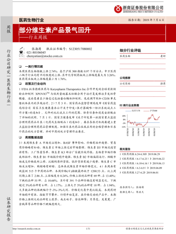 【浙商证券】【20190706】医药生物行业周报:部分维生素产品景气回升-31页 行业研究