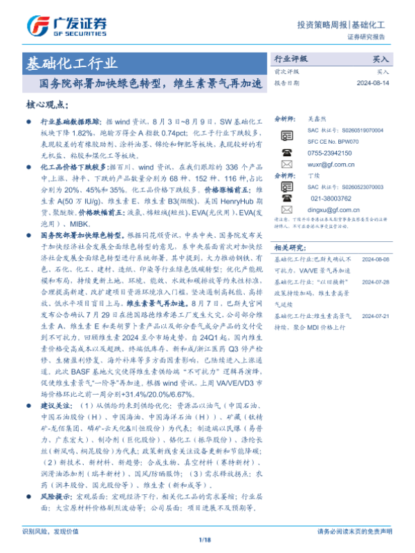 【广发证券】【20240814】20240814-广发证券-基础化工行业投资策略周报:国务院部署加快绿色转型,维生素景气再加速-18页 行业研究