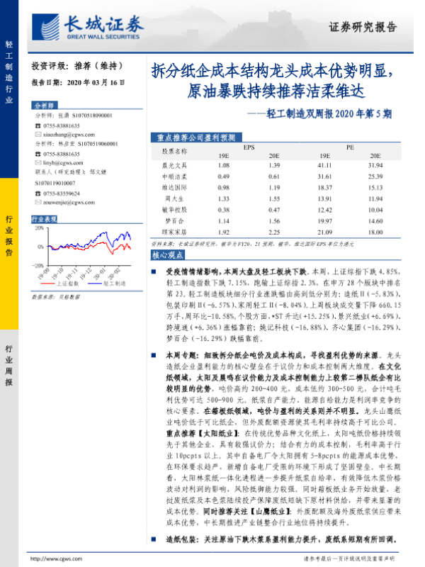 【长城证券】【20200316】轻工制造双周报2020年第5期:拆分纸企成本结构龙头成本优势明显,原油暴跌持续推荐洁柔维达-39页 行业研究