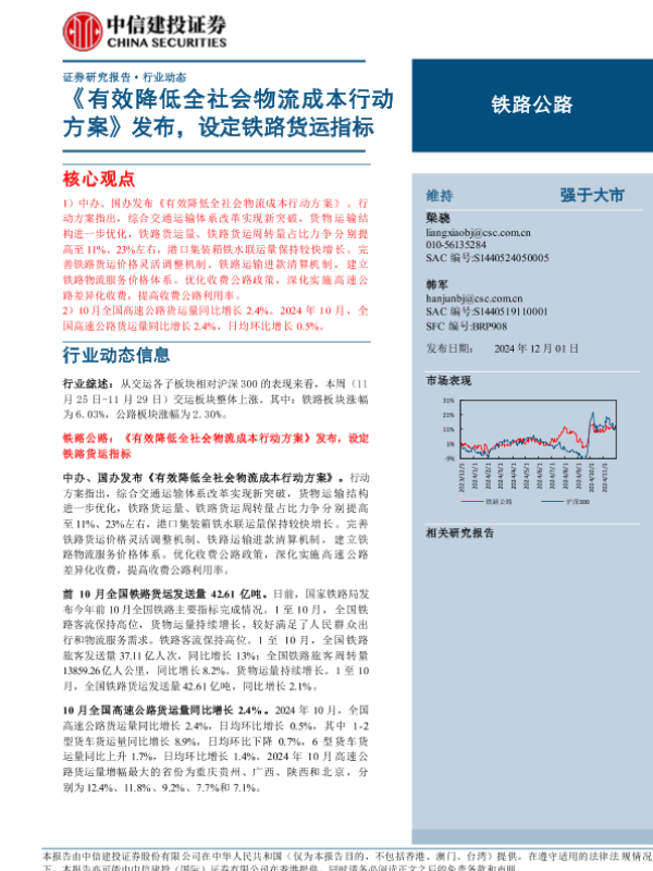 【中信建投证券】【20241201】铁路公路行业动态:《有效降低全社会物流成本行动方案》发布,设定铁路货运指标-12页 行业研究