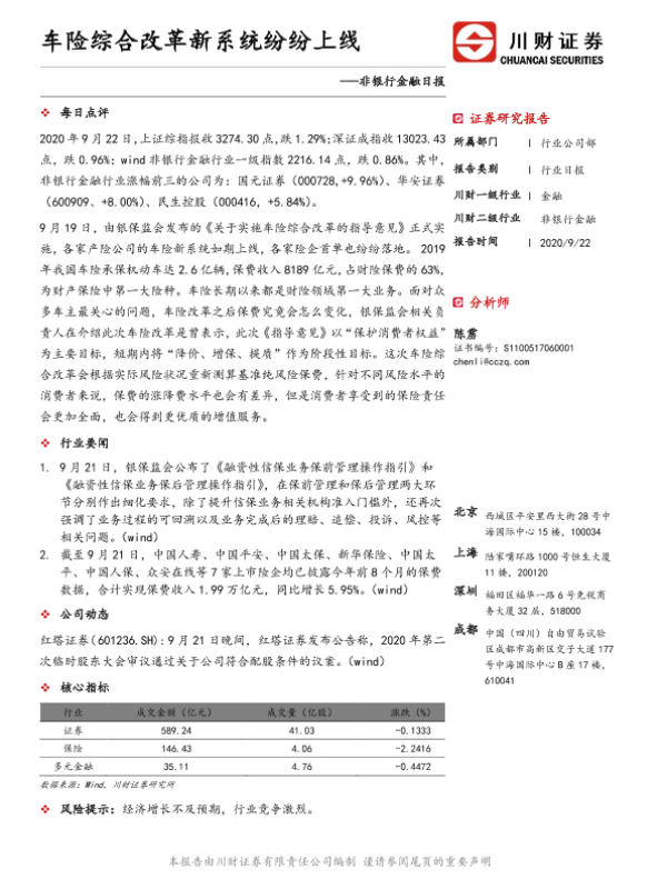 【川财证券】【20200922】非银行金融日报:车险综合改革新系统纷纷上线-2页 证券期货研究报告