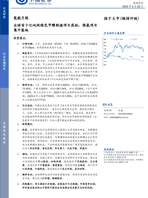 【华福证券】【20240220】氢能月报:全球首个亿吨级绿色甲醇制造项目获批,绿氢项目集中落地-10页 行业研究
