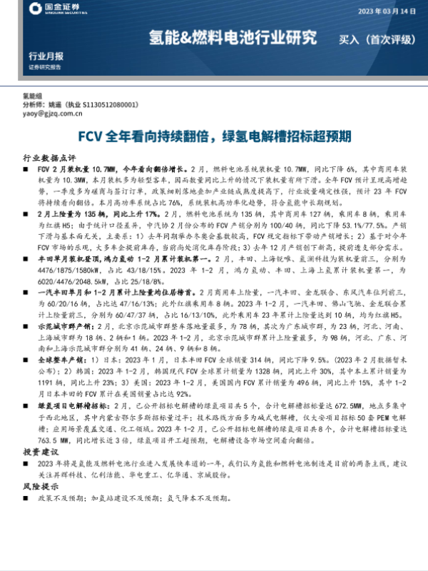 【国金证券】【20230314】20230314-国金证券-氢能&燃料电池行业研究:FCV全年看向持续翻倍,绿氢电解槽招标超预期-13页 行业研究