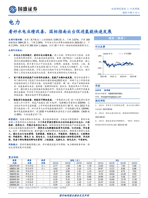 【国盛证券】【20230813】电力行业周报:看好水电业绩改善,国标指南出台促进氢能快速发展-13页 行业研究