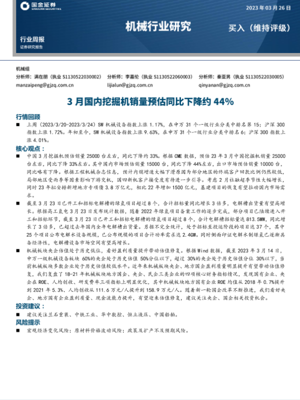 【国金证券】【20230326】20230326-国金证券-机械行业研究:3月国内挖掘机销量预估同比下降约44%-16页 行业研究